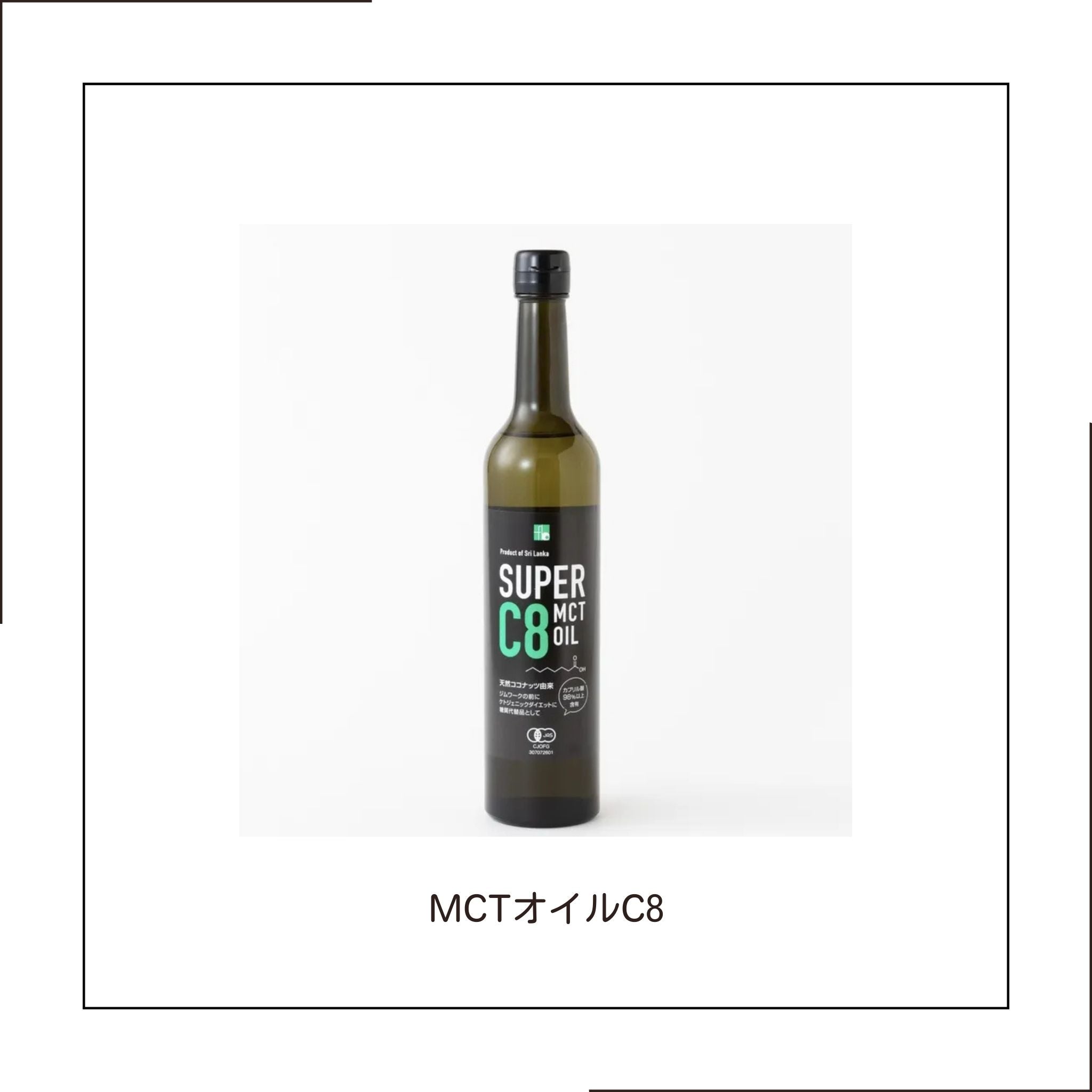 【C8オイルとは】MCTオイルは、C8(カプリル酸)とC10(カプリン酸)で構成された中鎖脂肪酸オイルです。 C8オイルは、MCTオイルからC8(カプリル酸)を抽出しつくされた、C8(カプリル酸)を95%以上含有するオイルです。カプリル酸(C8)を多く含むオイルは、MCTオイルに⽐べ消化・吸収が早く、また効率的にケトン体を生成し、早速脳筋⾁のエネルギーとなります。